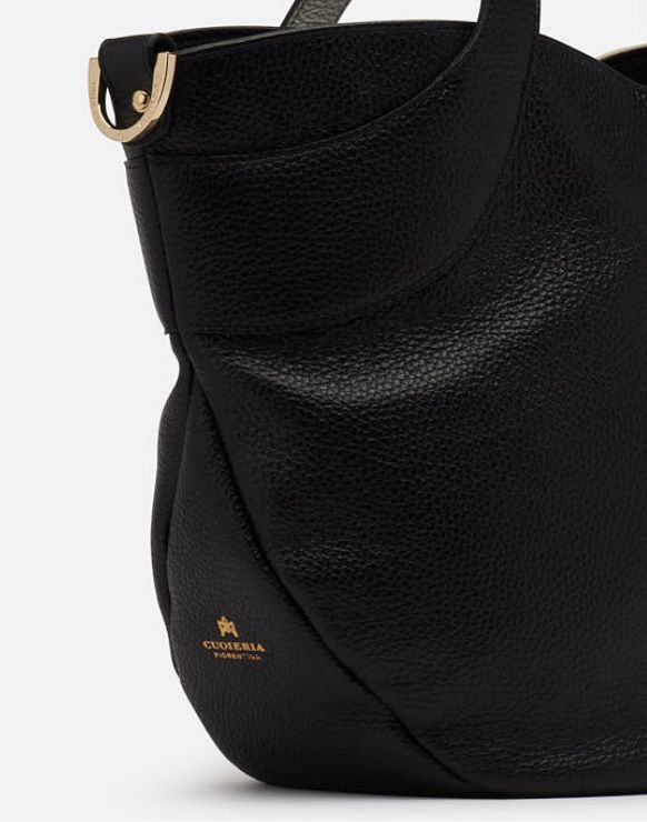 Eine Frage der Kontraste. Schwarz und Weiß in Harmonie, weiches Leder, durchsetzungsfähiger Stil: Das Gleichgewicht wird durch Unterschiede erreicht. Um jederzeit aufzufallen und aus dem Rahmen zu fallen, weiß Flora, wie man Weichheit und Charakter abwechseln kann.