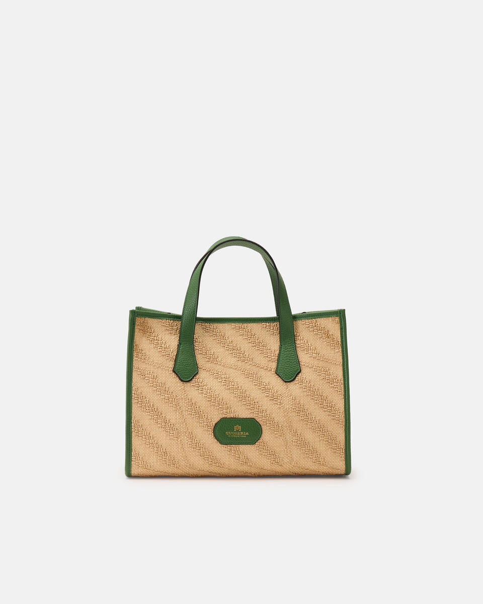 Raffia in neutralem Farbton mit Fischgrätenmuster und weichen Kalbsleder-Details als Kontrast.