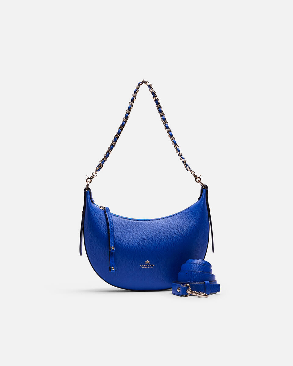 Die ideale Tasche für alle, die den Mond sehen wollen! Die kleine Hobo Eva mit ihrer reizvollen Halbmondform kann mit ihrer goldenen Kette faszinierend und fröhlich und mit ihrem verstellbaren Schulterriemen äußerst bequem werden. Die Vitaminfarben und der überschaubare, aber großzügige Innenraum machen es zu einem idealen Begleiter an Einkaufstagen im Stadtzentrum und zu einem charaktervollen Begleiter bei institutionellen Abendessen. Eine Explosion von Stil.